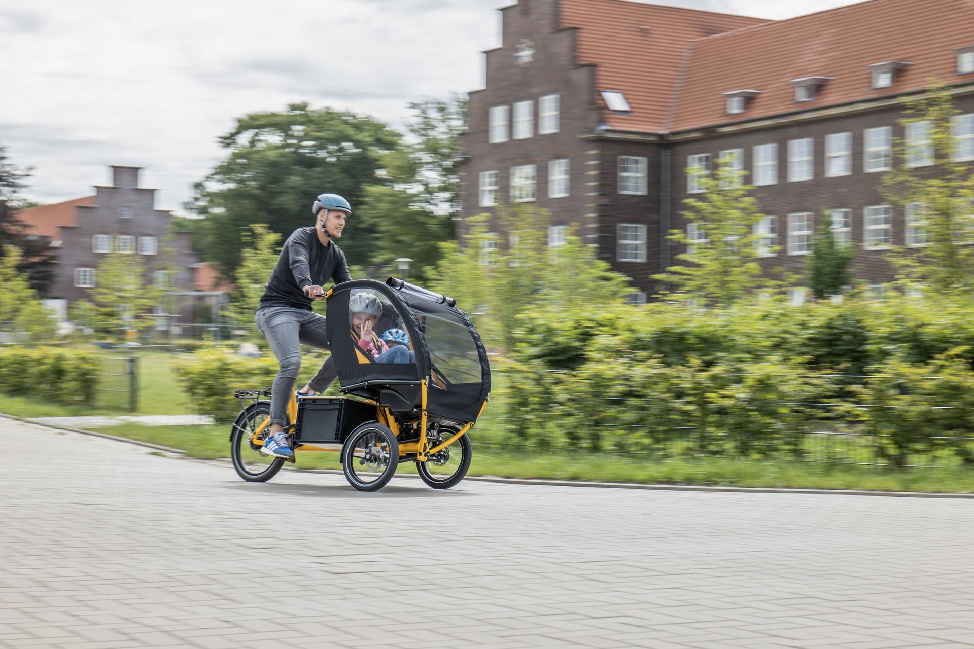 Du willst mobil bleiben, auch mit Baby und Kleinkind? Kein Problem! Im Chike e-Kids passt ein Maxi-Cosi sicher in die Kabine – und direkt daneben sitzt noch ein zweites Kind gemütlich. Alles gut geschützt, alles super bequem. Die gefederte Kabine gleicht Unebenheiten easy aus, und dank E-Antrieb kommt ihr entspannt überall hin. Kita, Spielplatz oder Wochenmarkt – das Abenteuer kann starten!